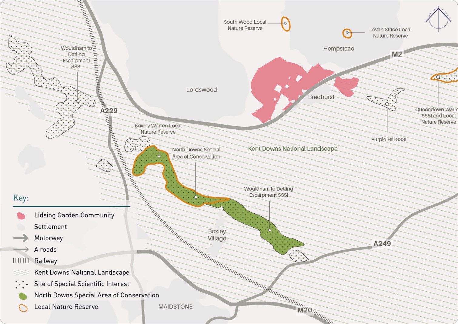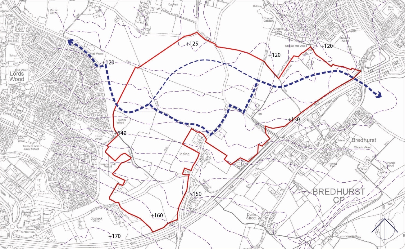 3.2.23. The new garden community of Lidsing is positioned between the Lordswood urban area (to the west) the Hempstead urban area (to the east) and the recreational hub of the Capstone Country Park to the north and the village of Bredhurst to the south with the village of Boxley further to the south.