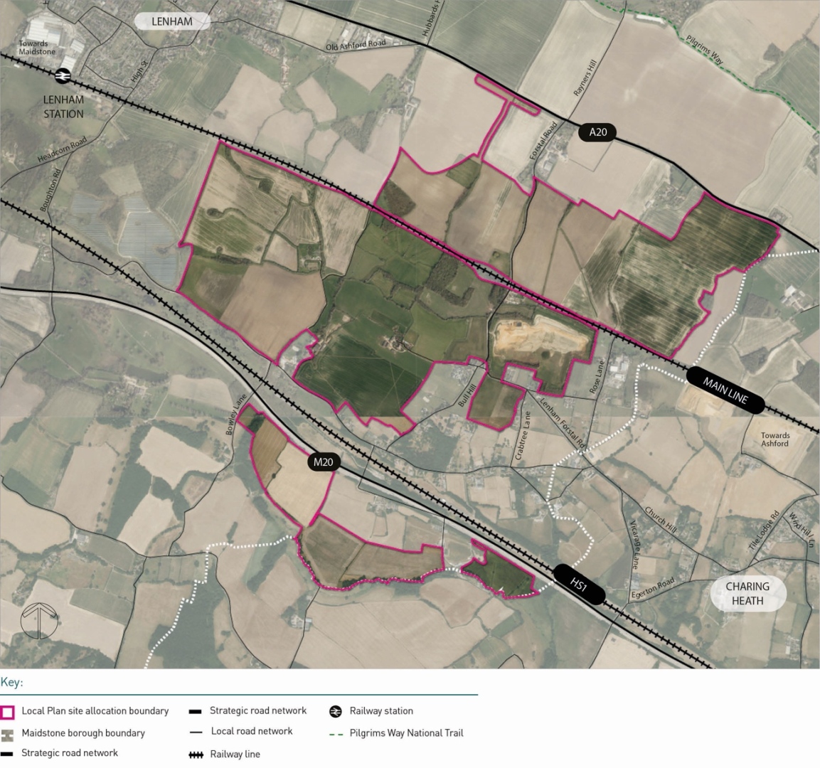 3.1.1. The site boundary immediately abuts the existing Hamlet of Lenham Heath. Its location follows the existing linear settlement pattern along the strategic road network (trunk motorway and main 'A' roads) and rail network. The urban areas of Maidstone and Ashford are located further away to the site's northwest and southeast respectively.