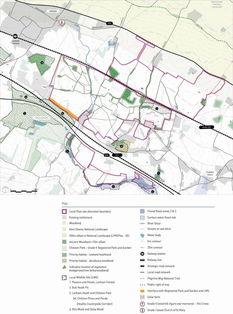 3.2.6. There are several areas of Ancient Woodland, other woodlands and hedgerows located within the site. A number of locally important non- statutory designated Local Wildlife Sites (LWSs) fall within 2km of the site, of which two fall within the site, Lenham Heath and Chilston Park Local Wildlife Site and the Pasture and Ponds, Lenham Forstal Local Wildlife Site. In addition, Bullheath Pit LWS is adjacent to the Site.