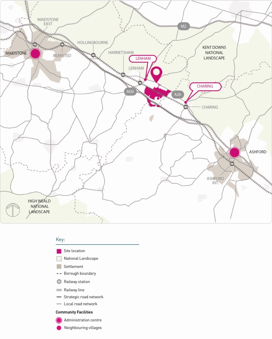 3.2.10. The Garden Settlement lies to the south of the A20 in between Lenham and Charing. The M20 runs through the area, with junction 8 around 10km to the west (towards Maidstone & the M25) and junction 9 around 12km to the east (Ashford).