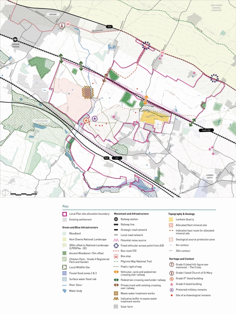 3.2.3. Parts of the site are subject to minerals workings and restoration. Lenham Quarry is an established quarry (fully excavated and now being restored) located immediately to the south of the London to Ashford railway line to the east of Forstall Road. Chapel Farm, located in the south-west of the site boundary is an identified future quarry which is due to be excavated from 2027/28. Both quarries are to be restored so they will sit lower than their immediate surroundings.
