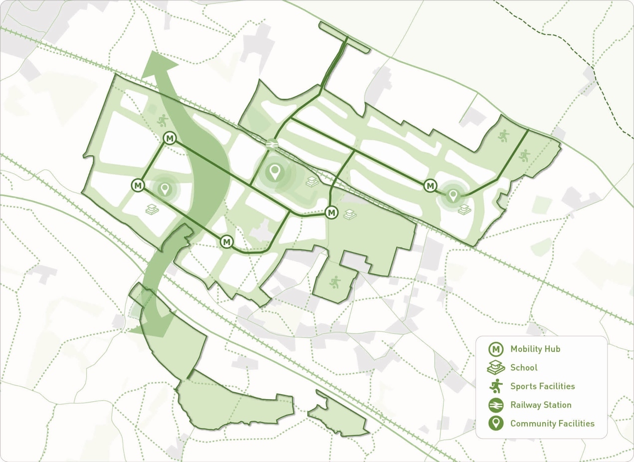5.3.9. Mobility hubs that bring different travel modes together will be integrated into key destination points and activity nodes throughout the settlement, providing excellent sustainable travel choices for movement throughout and beyond the settlement. Hubs will also facilitate transitions between local, active modes (walking and cycling) and longer distance sustainable travel options (bus and rail).