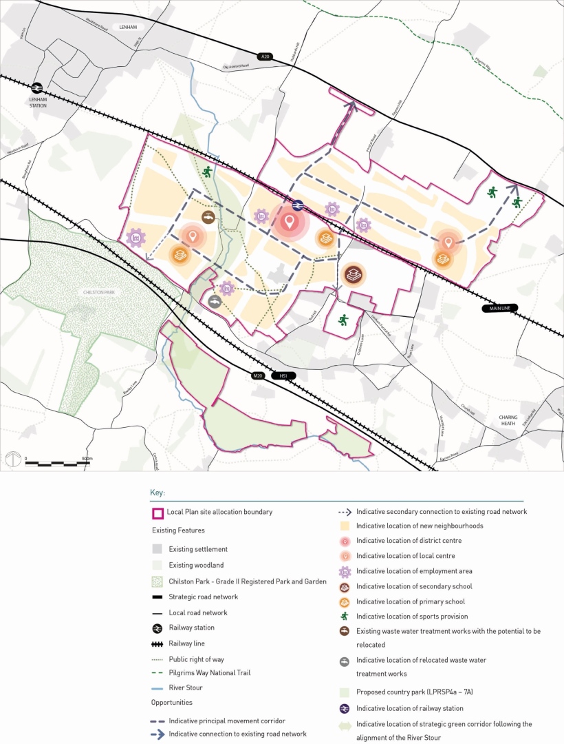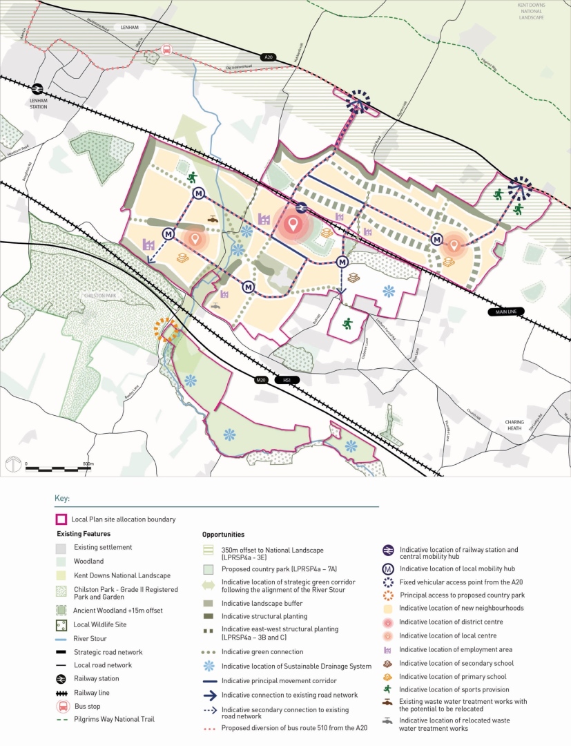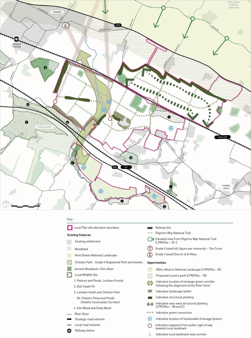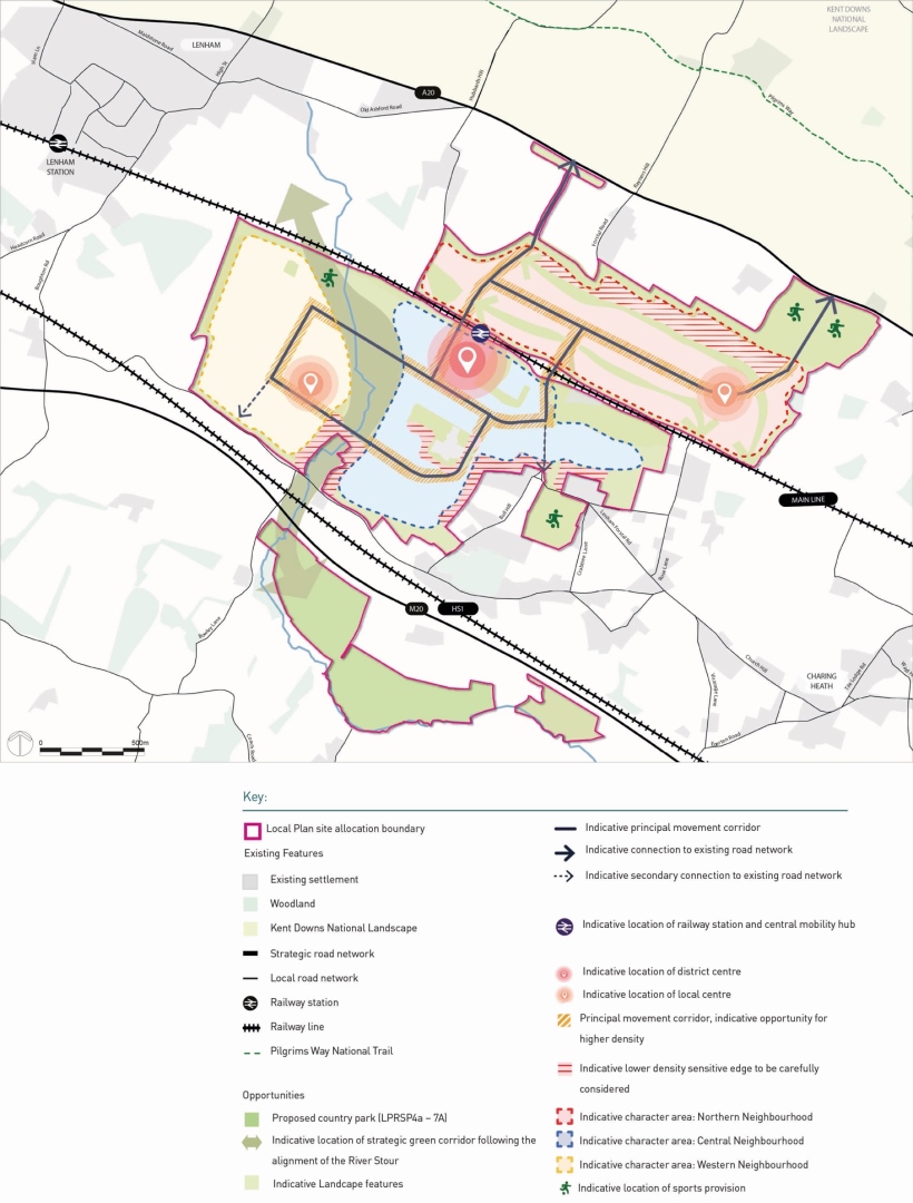 5.5.1. The location for Heathlands has been selected to allow for generous landscape gaps to the east and west of the settlement avoid the physical coalescence of Lenham, Charing Heath and Charing. The Garden Settlement will create its own character and identity, distinct and separate yet complementary to those in existing local settlements across the area.