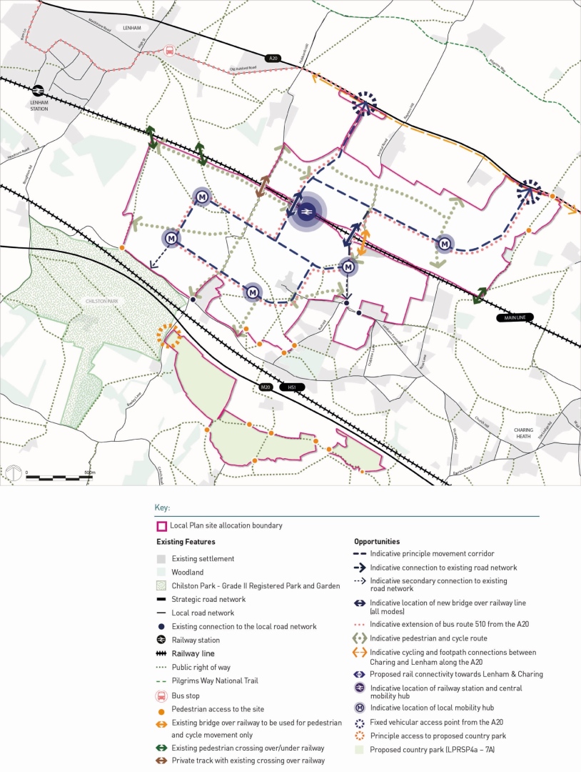 5.3.4. There are numerous Public Rights of Way (PRoW) providing connections across the site, including existing PRoW connections into the centre of Lenham, Charing Heath, Charing and Pilgrims Way. A new network of attractive pedestrian and cycleways will enhance existing local networks and positively support active and healthy lifestyles.