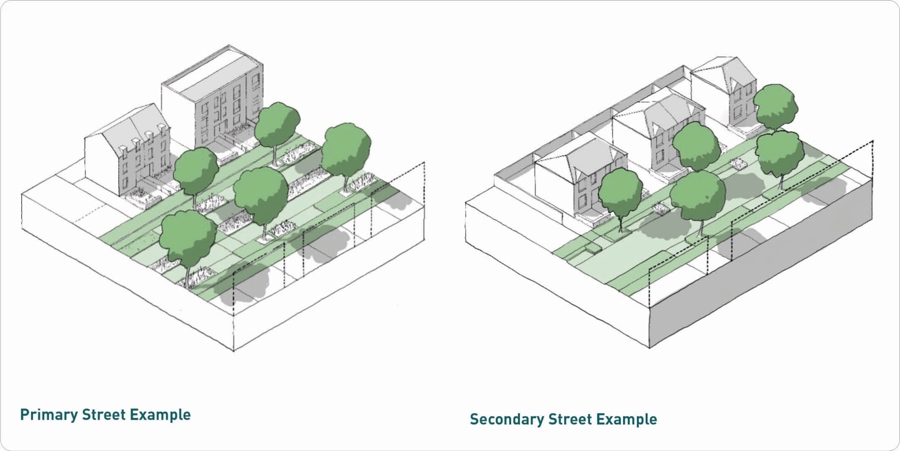 6.11.4. A hierarchy of street types must be established and applied consistently throughout the site. The hierarchy will provide for a safe environment for pedestrians, cyclists and those with mobility impairments. They will include street trees and other planting and the use of sustainable urban drainage systems including swales and ponds to contribute to biodiversity and manifest Heathlands' Garden Settlement character. More details around streets including widths and the incorporation of active travel and green infrastructure and wildlife-friendly surface water drainage infrastructure must be set out in future Design Codes.